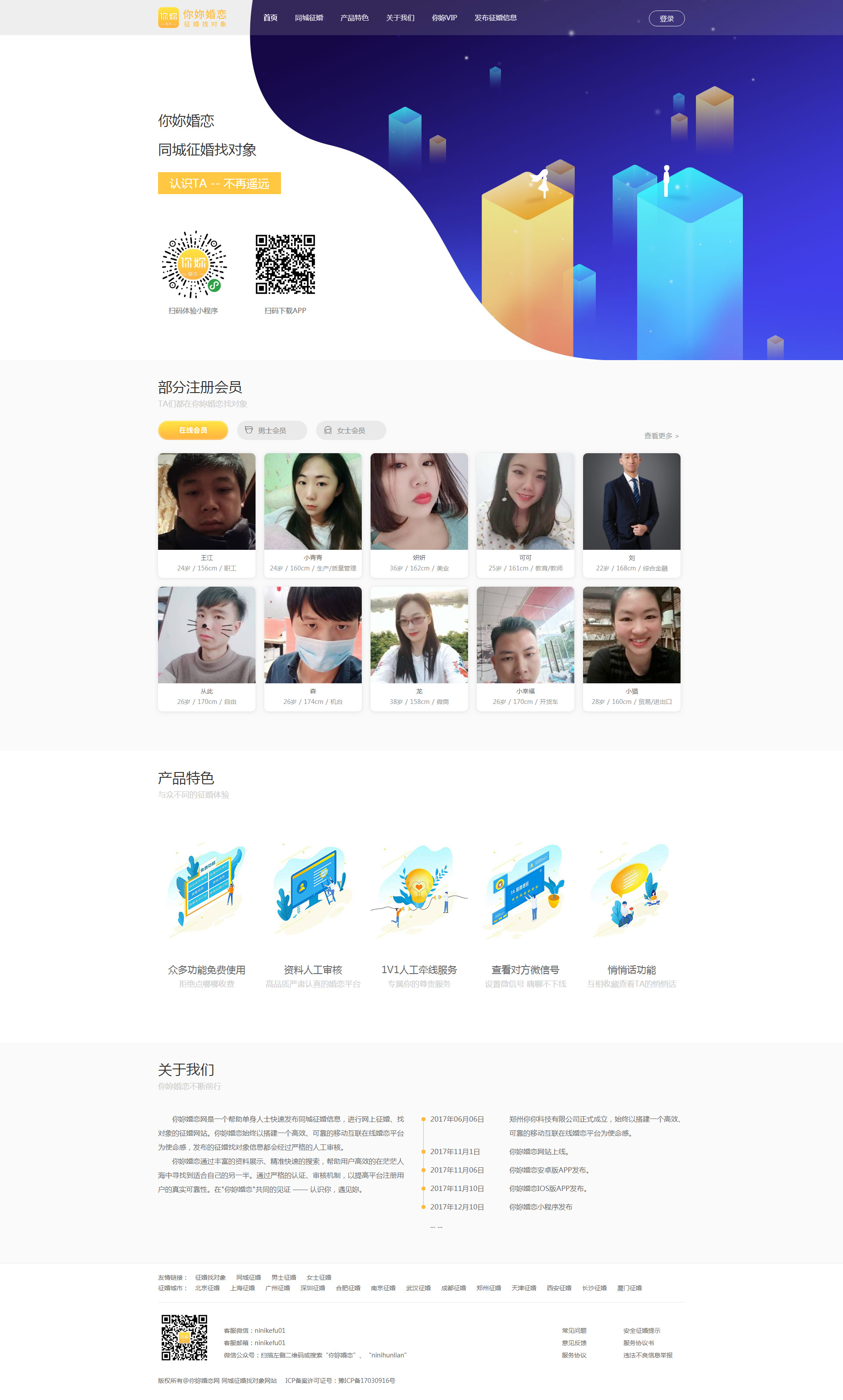 你妳婚戀網致力于搭建一個健康和諧,高效可靠的婚戀平臺,為用戶提供尋找愛情,尋找伴侶服務,通過搜索發(fā)信和心靈匹配結合的方式,幫助各個年齡階段的單身人士在茫茫人海中找到Mr.Right。公司有嚴格的審核機制和嚴格的認證方式,嚴謹,嚴肅的管理模式,提高平臺用戶的真實性和可靠性。